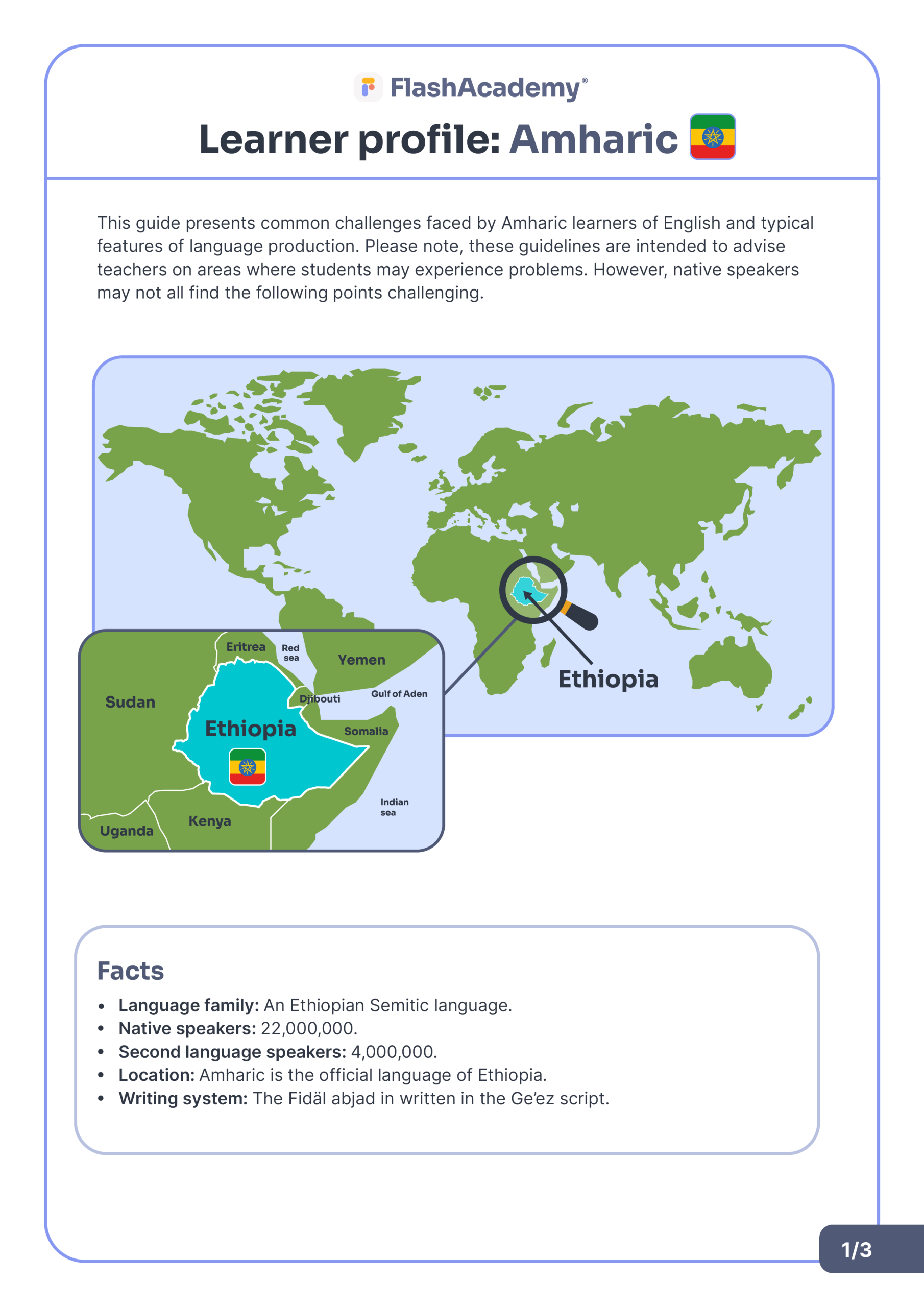 This guide presents common challenges faced by Amharic learners of English and typical features of language production.